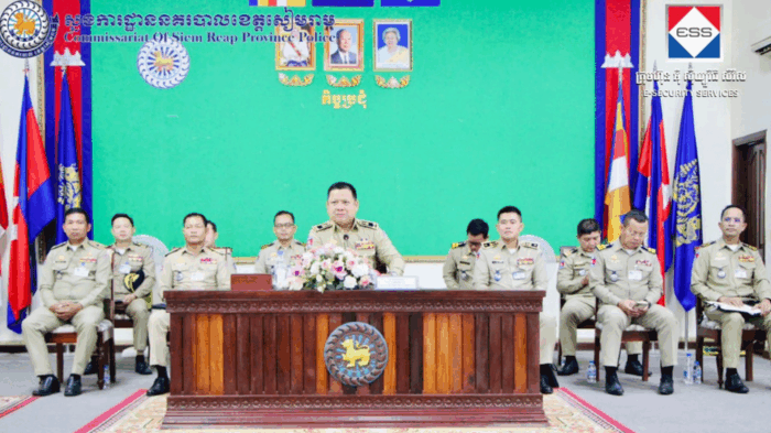 សៀមរាប ៖ នៅរសៀលថ្ងៃពុធ ១៤កើត ខែអស្សុជ ឆ្នាំរោង ឆស័ក ពុទ្ធសករាជ ២៥៦៨ ត្រូវនឹងថ្ងៃទី១៦ ខែតុលា ឆ្នាំ២០២៤ វេលាម៉ោង ១៤:៣០នាទី នៅសាលប្រជុំស្នងការដ្ឋាននគរបាលខេត្ត លោកឧត្តមសេនីយ៍ទោ ហួត សុធី ស្នងការ នៃស្នងការនគរបាលខេត្តសៀមរាប អញ្ជើញដឹកនាំកិច្ចប្រជុំបូកសរុបលទ្ធផល ការងារសន្តិសុខឯកជន ជាមួយក្រុមហ៊ុនផ្តល់សេវាសន្តិសុខ និងសហគ្រាសគ្រឹះស្ថានប្រើប្រាស់ កម្លាំងភ្នាក់ងារសន្តិសុខផ្ទាល់ខ្លួន។ ដោយមានការអញ្ជើញចូលរួមពី លោកស្នងការរង លោកនាយ-នាយរងការិយាល័យចំណុះផែនការងារសន្តិសុខ ក្រុមហ៊ុនផ្តល់សេវាសន្តិសុខ ក្រុមហ៊ុន E Security Service និងសហគ្រាសគ្រឹះស្ថានដែលពាក់ព័ន្ធផងដែរ។