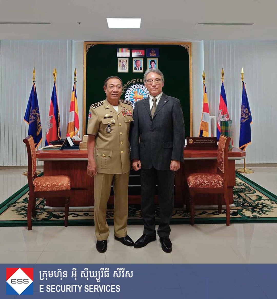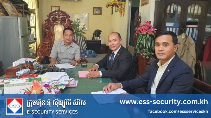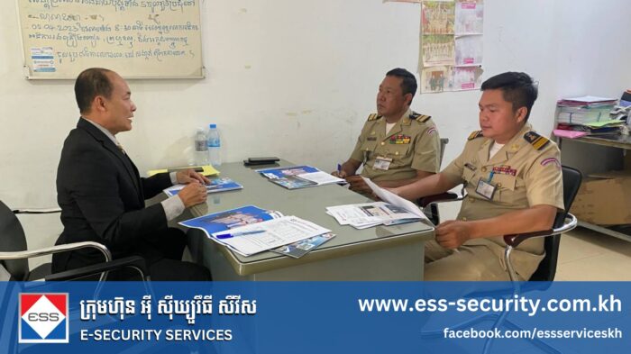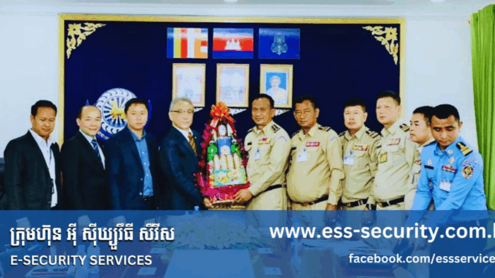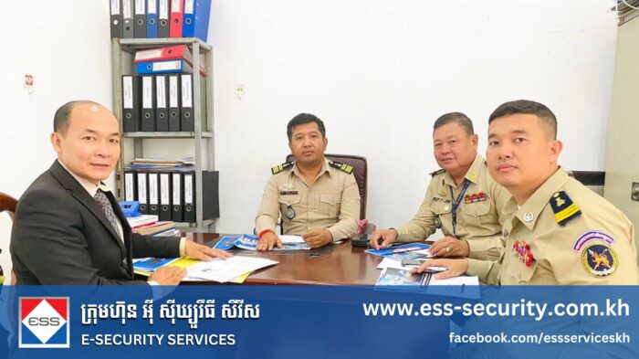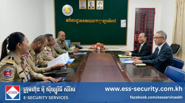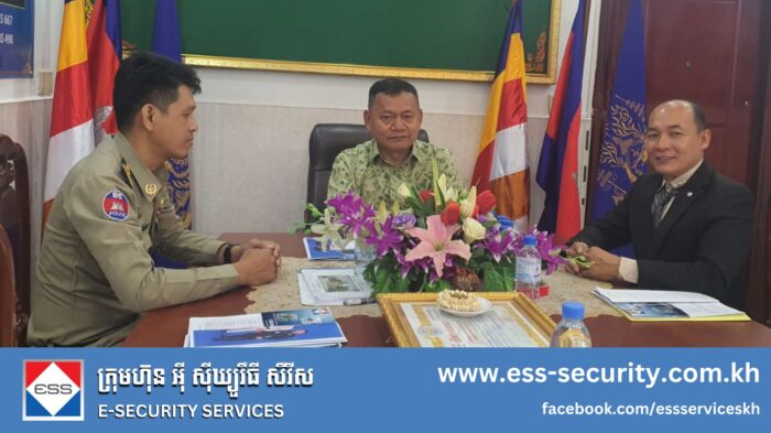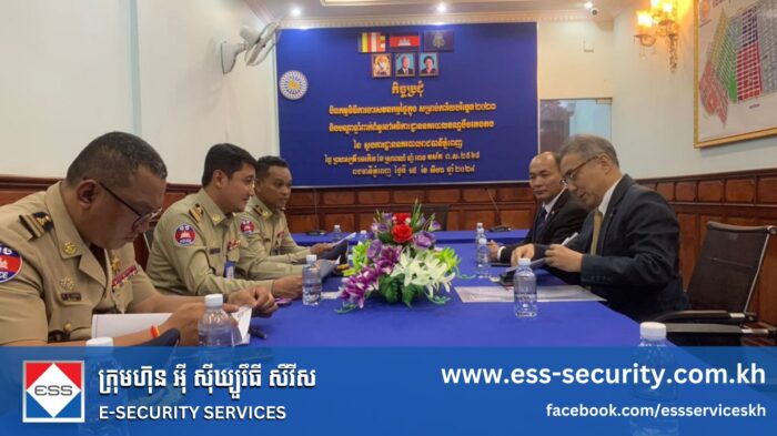 កាលពីខែកញ្ញាឆ្នាំ២០២៤ក្រុមហ៊ុន E SECURITY SERVICES Co.,Ltd (ESS) រួមទាំងក្រុមការងារ បានជួបសំដែងការគួរសម និងពិភាក្សាការងារ ហើយឆ្លៀតក្នុងឱកាសនោះ ក៏បាននាំមកនូវ ទឹកសុទ្ធរួមទាំង អាហារសម្រនមួយចំនួន ឧបត្ថម្ភ ដល់កងកម្លាំងនៃអធិការនគរបាលទាំង១៤ខណ្ឌនៅក្នុងរាជធានីភ្នំពេញ។